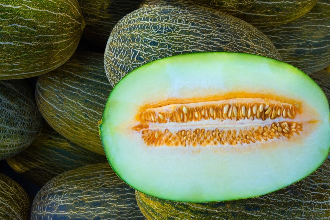 Le Piel de Sapo fait partie de la famille des melons, et est connu pour sa peau inhabituelle. Son nom d’origine espagnole signifie « peau de crapaud », en raison de son aspect fissuré vert marbré. Sa chair blanche est d’une qualité exceptionnelle et le goût est semblable à celui d’un melon Honeydew mais bien meilleur encore.